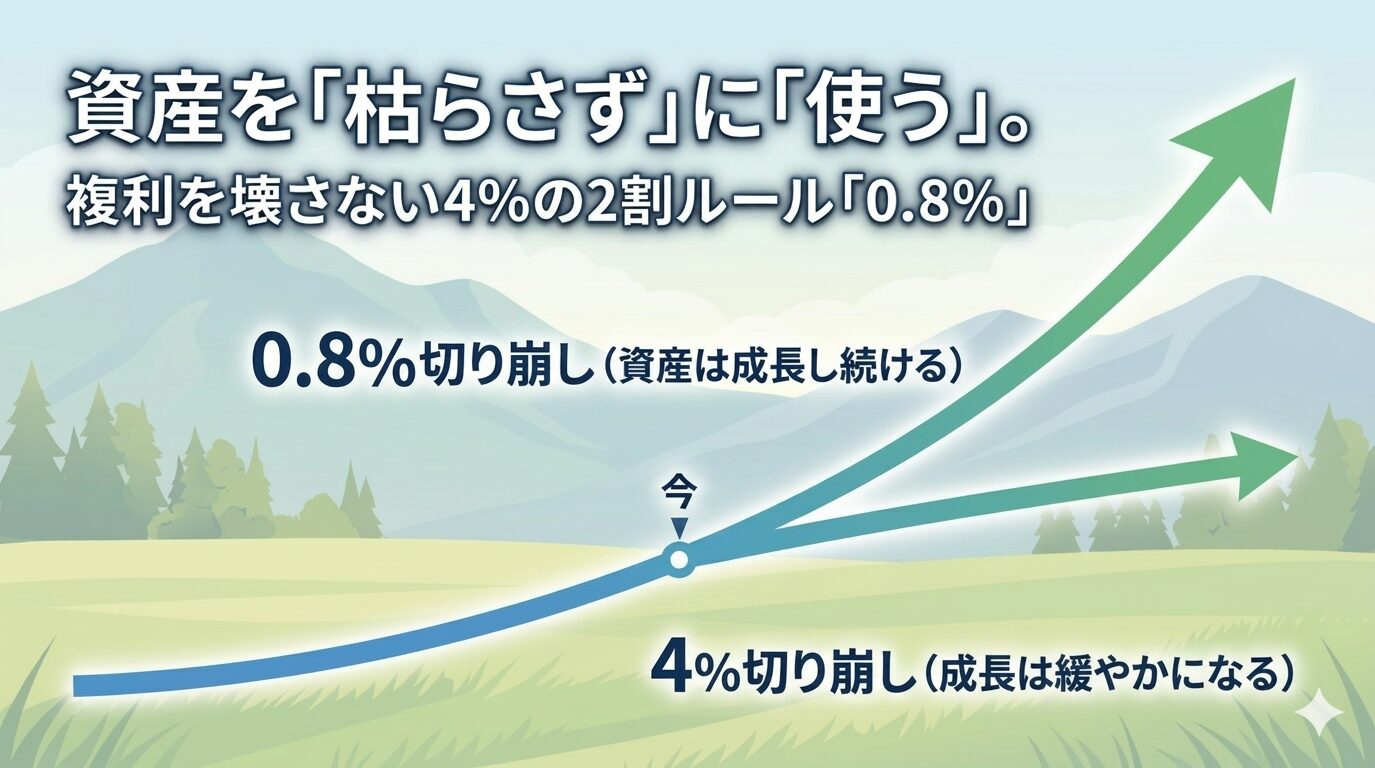 確かに、すでに数億円の資産があり、仕事を辞めて「FIRE(経済的自立)」を達成した人なら、この4%ルールは正解でしょう。しかし、私たちのような「絶賛、資産形成中」の現役世代が4%も引き出してしまうと、複利の加速力が大幅に鈍ってしまいます。